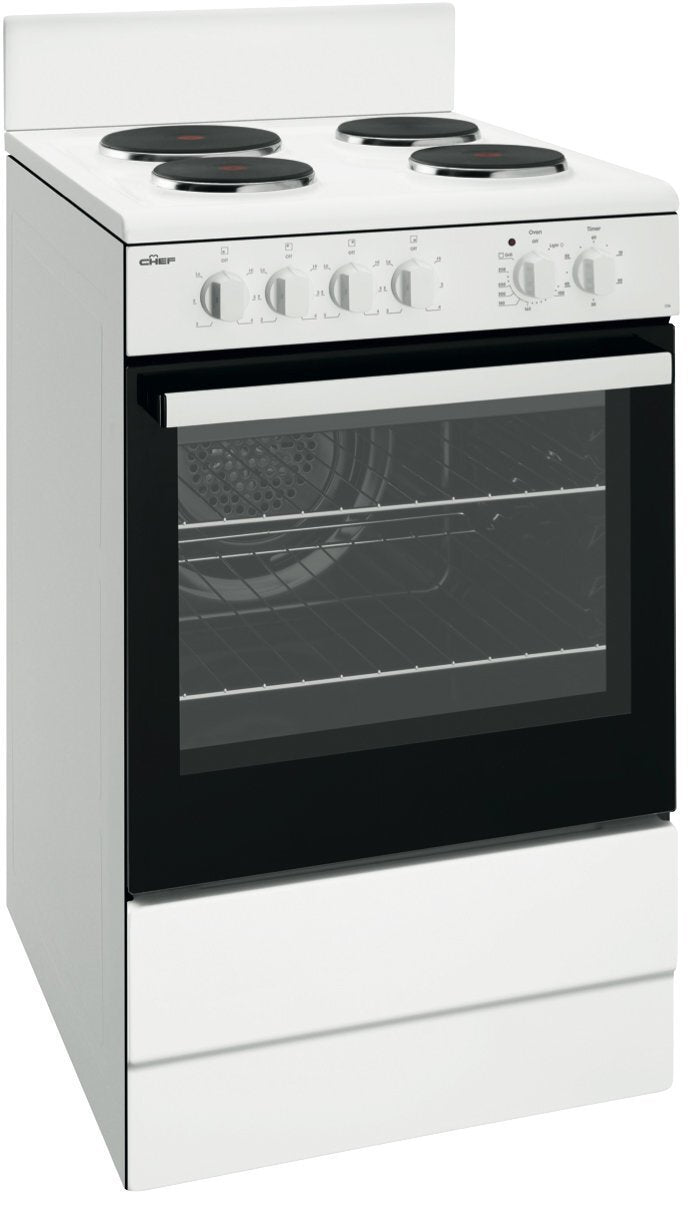 The Chef 54cm Electric White Freestanding Oven CFE536WB is a practical and reliable cooking solution, ideal for everyday family meals. Featuring a fan forced electric oven with integrated grill, timer, and internal light, it delivers even heat distribution and consistent cooking results.