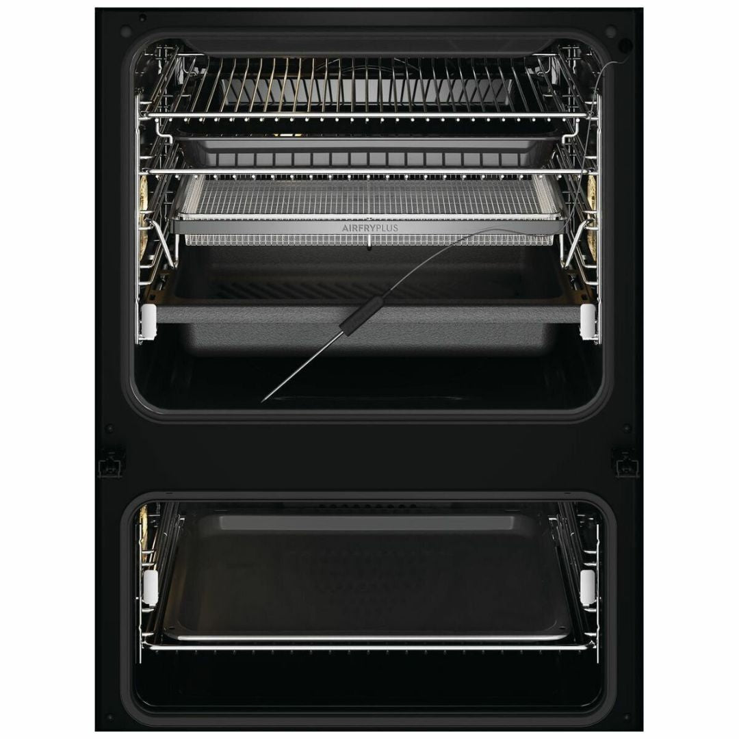 Electrolux 60cm Pyrolytic Dark Stainless Steel Double Oven EVEP626DSE delivers premium performance and flexibility with its UltimateTaste 900 multifunction duo design. Featuring an 80L main oven and 46L secondary oven, it offers 17 functions in the main cavity including SteamBake and AirFryPlus for bakery-style bread and crisp, golden results with minimal oil. The intuitive TFT touchscreen, Smart Food Probe and automatic programs take the guesswork out of cooking, ensuring precise and consistent results every time.